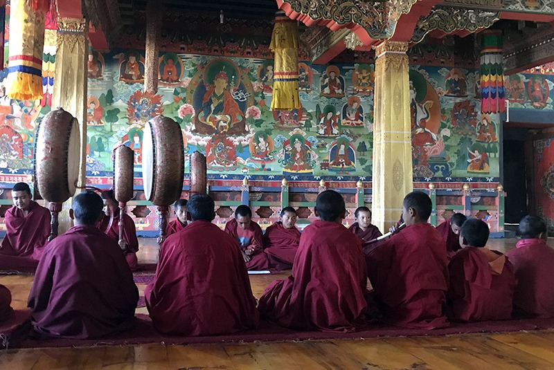 While most of the monks were chanting or playing instruments, I was amused to see several who were quite playful with one another, trading quiet jokes and tugging on each other’s clothing. Several monks pulled out cell phones; one made a quiet phone call amidst the chanting, and others followed along electronically using a Buddhist app. So the past met the present in Bhutan.
