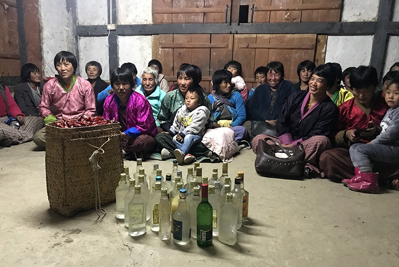 On our final night, the Takin villagers dressed up and threw us a big party. Each household brought bottles of ara (they were very proud to share, as it’s the only resource they feel they can offer). The center of the room was filled with bottles. Each family would take a turn placing the bottle and would welcome us. I was invited to dance and we performed a song that Jigme had written for us. We all went to bed well before the villagers—they celebrated long into the evening!