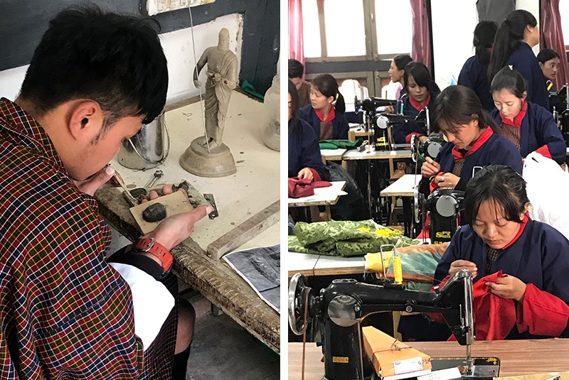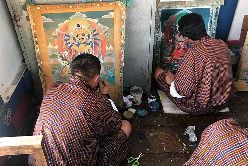 Our trek route included visits to several schools, where we learned that all students are taught English and encouraged to develop practical skills. One highlight was in Thimphu, where we visited Choki Traditional Arts School. There, students were engaged in honing a variety of cultural specialties, including painting, sculpting, sewing, carving, and metalwork. Our guides told us that the government is committed to growing the next generation of Bhutanese artists and perpetuating their country’s artistic traditions.