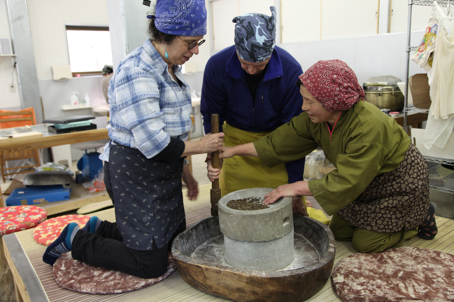 Under the guidance of four cheery yet business-like, 60-something Japanese ladies, we turn buckwheat into flour using an old grinding stone, mix in water to transform the flour into dough, kneed it, roll it flat, and slice it into even, narrow strips. Our instructors, who speak no English, seem equally disconcerted and entertained by our lack of skill. They correct us and direct us and we all repeatedly dissolve into fits of laughter. None of us visitors would have guessed that making noodles would be so challenging. We check on each other’s work along the way, with good-natured teasing thrown in. By the time we drop our noodles into the giant pot of boiling water, we defer completely to the experts, letting them pull out the noodles at just the right moment.