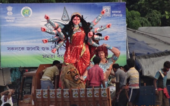 We watched a statue of Durga being drawn toward the Hooghly River for her immersion in the sacred waters, the final chapter in the Durga Festival. The gnarly lion at her feet is her “vehicle”. These days there is a crane standing by to scoop the remnants from the waters in order to be kinder to the environment.