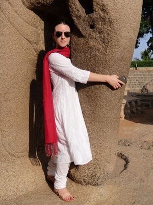 Here, Sam hugs the elephant trunk of a life-sized sculpture located at Mamallapuram.