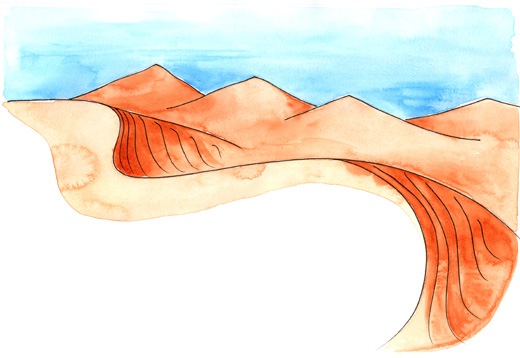 When I look up, our letter rises all around—dune after dune in every direction; I’ve walked until the entire horizon is arcing sand.