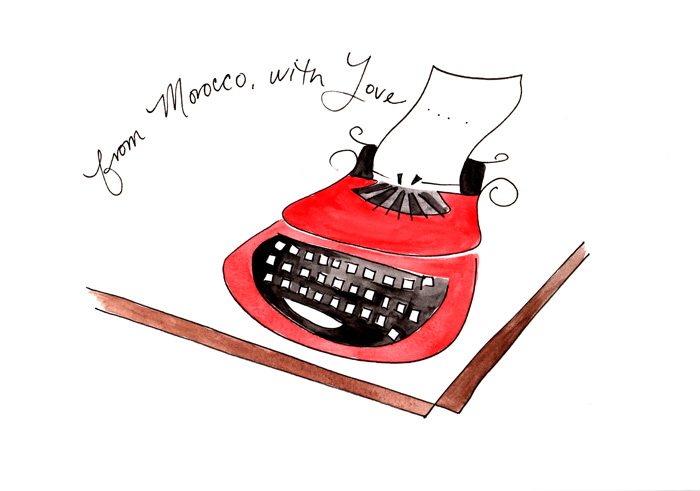 I type “Once upon a time,” but there is no ink left in the ribbon. I lean forward and can just make out where the keys hit the paper’s grid lines. Then I scan up the page. Goosebumps stipple my arms. Another, inkless writer typed a phrase just before my own: from Morocco, with love.