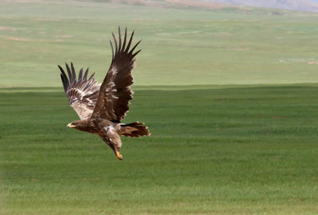 Driving toward Kharkhorin, Mongolia, we were waiting and watching this raptor to see what he would do. It was awesome watching this bird take off and soar right in front of us—so free and powerful in this wide-open space.