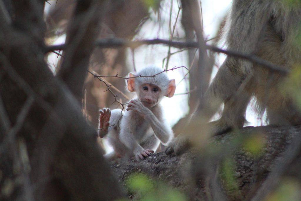 On safari in the South Luangwa, Zambia, a sweet baby baboon pauses from romping around to observe humans from the safety of his mom’s side. He stands out from his playmates because he is all-white, but he’s not albino—he has a genetic mutation called leucism, which causes partial reduction of pigment.