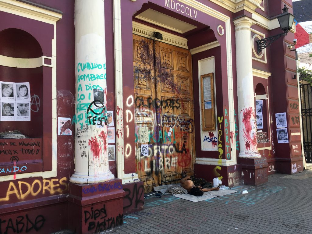 Taken in Santiago, Chile in November 2019, as the second wave of protests began. Most of the buildings were covered with graffiti and posters of those who had died. You can’t see the crowds of people outside the frame, but most were wearing bandanas tied around their faces as masks, to protect from tear gas. This building faced my hotel, and this man lay in the doorway all day as throngs of people walked past him.