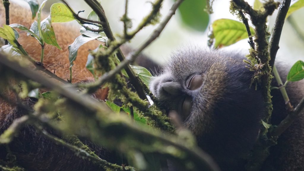 Hiking amongst the whimsical bamboo forests of Volcanoes National Park in Rwanda, we came upon a troop of sociable golden monkeys. Numbering at least 50, these endearing—and endangered—primates scampered among the trees and playfully bound from limb to limb. This guy was fast asleep resting on branches and his mother’s back. Most people visit Rwanda to see the famous mountain gorilla, but Rwanda’s many other primate species will also steal your heart.