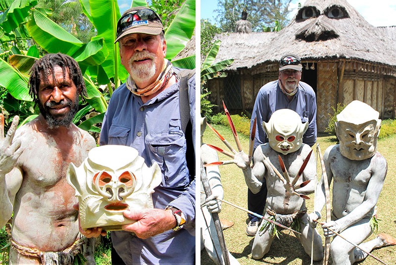 No two Papua New Guinea masks are alike: Each springs from the imagination of its maker. They might have horns or tusks, ears or a gigantic nose, be partially painted, or have messages etched inside. The original intent was always to strike fear into one’s opponent. They are sun-dried rather than baked, and the process takes many days. The end result is surprisingly heavy. Weighing upwards of 20-25 pounds and sitting directly on the wearer’s collarbone, they take a toll. After a ceremony, the Mud Men are bathed in sweat. When I tried to put a mask on, it took several different ones before my Western-sized nose could be accommodated without crushing it. Kowa said no padding could be used as it would “not be real.”