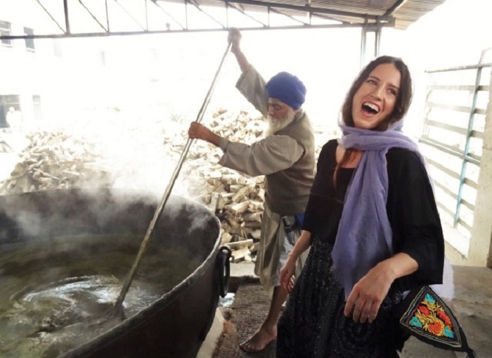 Sara Barbieri: In the Punjab state of northern India, the langar (community kitchen) at the Golden Temple offers meals to any and all, serving as many as 40,000 people on any given day. Anyone can volunteer, and though there are no sign-up sheets, no particular times you are supposed to appear, there is simply a constant flow of volunteers that makes this kitchen function. My niece Sam and I each took a turn stirring an enormous pot of dal lentils and feeling, just for a moment, part of the inspiring effort.
