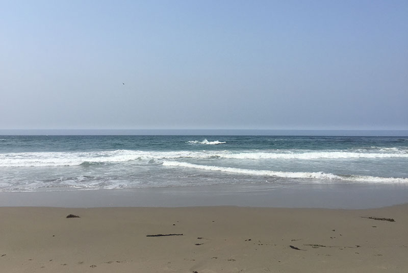 I found a place to pull over and park, stuffed my bread, cheese, and orange juice into my backpack, and followed the trail of cars to an opening with a sign that said “Bonham Trail to Cooks Beach.” A tree-lined, sun-dappled, dirt-and-rock path descended steeply. I followed this and after a few minutes emerged onto a pocket beach with everything I could want: sand, sun, waves, driftwood. The beach was demarcated by massive black and brown rock outcroppings on either side and was so compact that it would take about three minutes to walk from one side to the other. Three people were there, two reading on lawn chairs and one simply sitting in the sand and smiling.