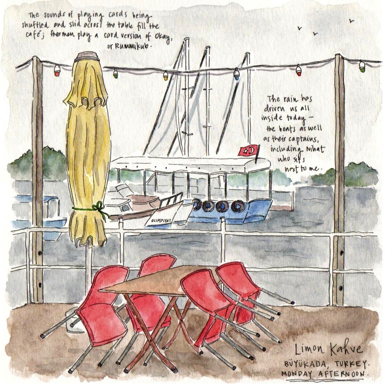 I befriend one of them, Mehmet, who treats me to a cup of tea and ensures the name of his vessel – the Olympiat – makes it into the picture. And as I sit here next to him in the smoky teahouse, sketching the boats bobbing in the harbor and listening to the men shuffle cards and okey tiles, I marvel for a moment that but for an internet search, I wouldn’t have discovered this world.