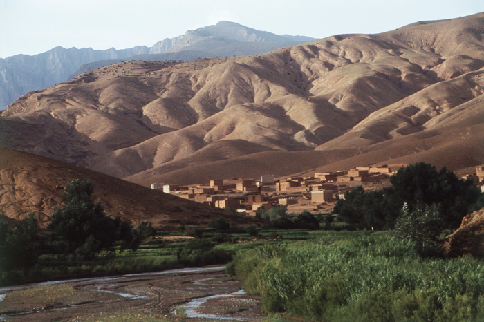 The road out of Tangier was clear and straight and everyone, indeed, drove on the right. There was modern traffic and the mountains rose out ahead of us. Along the way we passed hand-drawn carts and people carrying things on foot and on their heads, and many just standing on the dusty shoulder, watching us go by. It was the undifferentiated, third-world interface of urban, ex-urban and rural– pretty much the way I expected it. Mexico in Arabic.