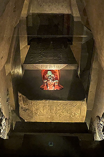 The climax of our museum visit came when we approached the tomb of Pakal the Great. We had stood outside the Temple of the Inscriptions in Palenque as our guide Roberto told us the tale: Explorer-archaeologists had spent decades examining and excavating the site, then in 1949 Mexican archaeologist Alberto Ruz Lhuillier began working there. Lhuillier postulated that there might be a hidden chamber in the temple, spent four years removing debris to reveal a staircase, and finally in late 1952 discovered the burial chamber at the bottom of the staircase. Then, in one time-stopping moment, he and his assistants lifted the heavy stone lid of the sarcophagus to reveal the figure of Pakal lying in bejeweled splendor.