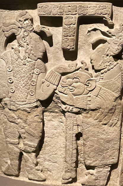 The climax of our museum visit came when we approached the tomb of Pakal the Great. We had stood outside the Temple of the Inscriptions in Palenque as our guide Roberto told us the tale: Explorer-archaeologists had spent decades examining and excavating the site, then in 1949 Mexican archaeologist Alberto Ruz Lhuillier began working there. Lhuillier postulated that there might be a hidden chamber in the temple, spent four years removing debris to reveal a staircase, and finally in late 1952 discovered the burial chamber at the bottom of the staircase. Then, in one time-stopping moment, he and his assistants lifted the heavy stone lid of the sarcophagus to reveal the figure of Pakal lying in bejeweled splendor.