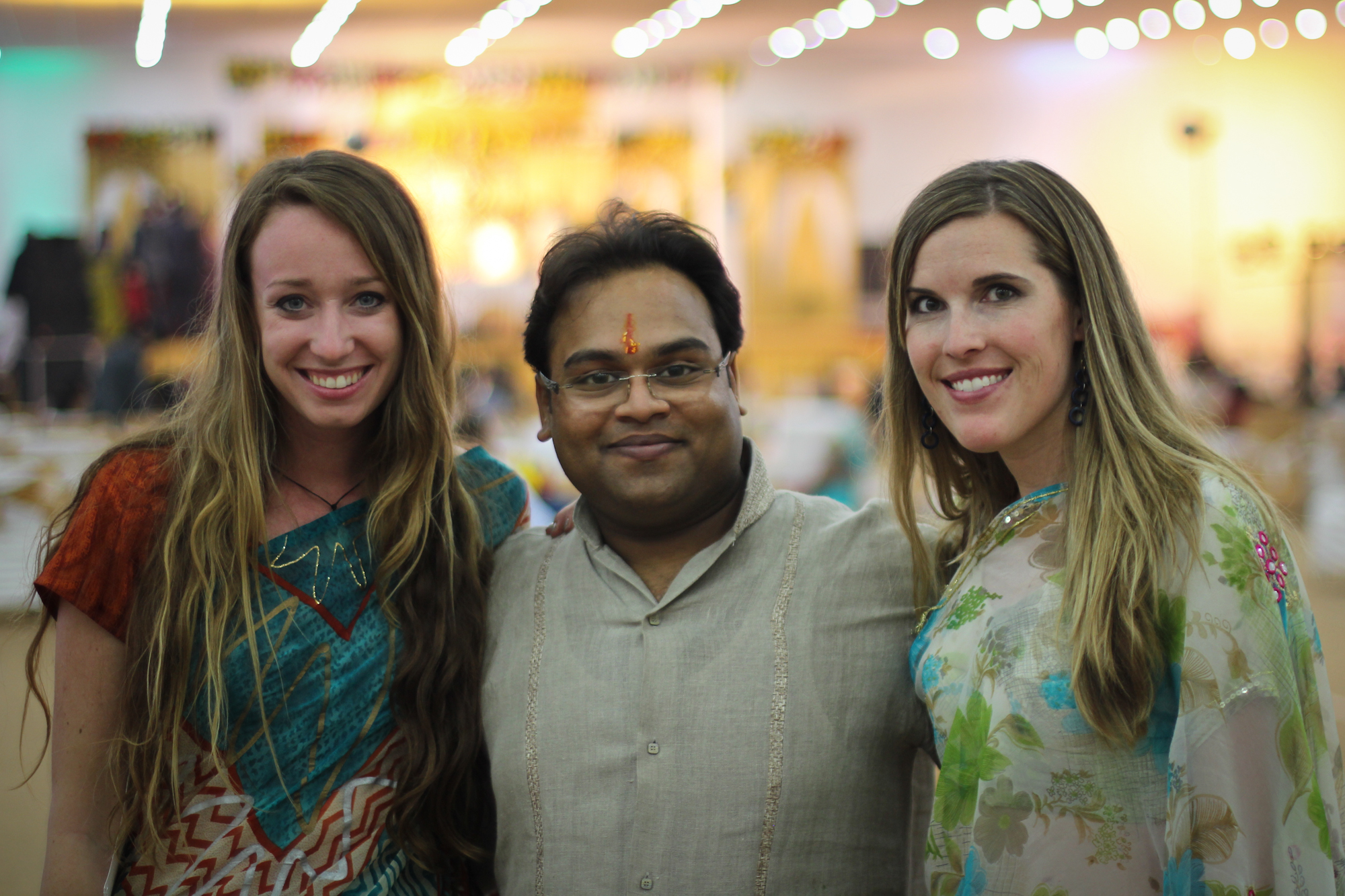 Serendipitously, I had been given two saris just the month before, and my Indian roommate Mallika helped Erin and me put them on. We stood there awkwardly, with our arms out to our sides, but as Mallika tucked and folded and draped the six yards of gossamer chiffon around each of us, it felt as though we were being transformed, wrapped in someone else’s culture for the day. Instead of writing out name cards, we donned matching colored bangles, bought sweets for the new couple – Rahul and Aayushi – and caught an auto-rickshaw to the ceremony. Even the can of Libby’s came along for the ride.