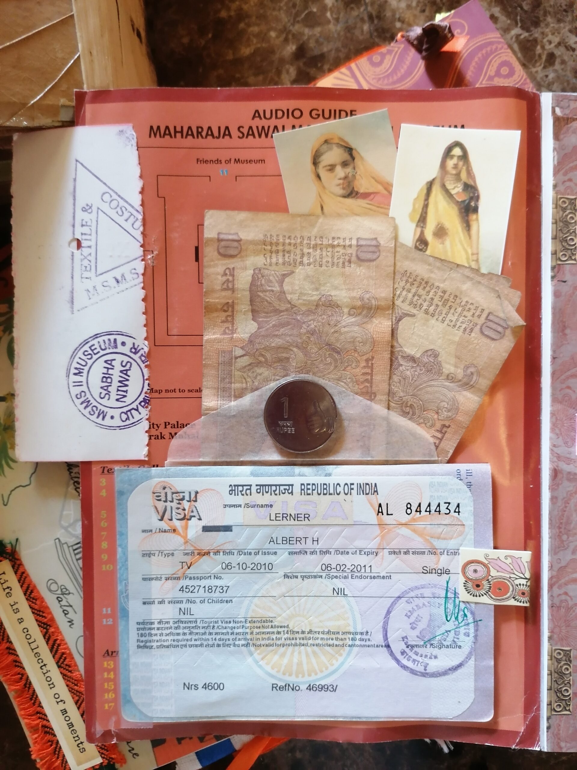 During the pandemic I created two 15-lb. travel journals of our 1 year honeymoon meander through Asia and SE Asia. Unbeknownst to my husband I had saved every ticket, program, museum catalogue and map*. The ephemera was juxtaposed with visas from our two expired passports.