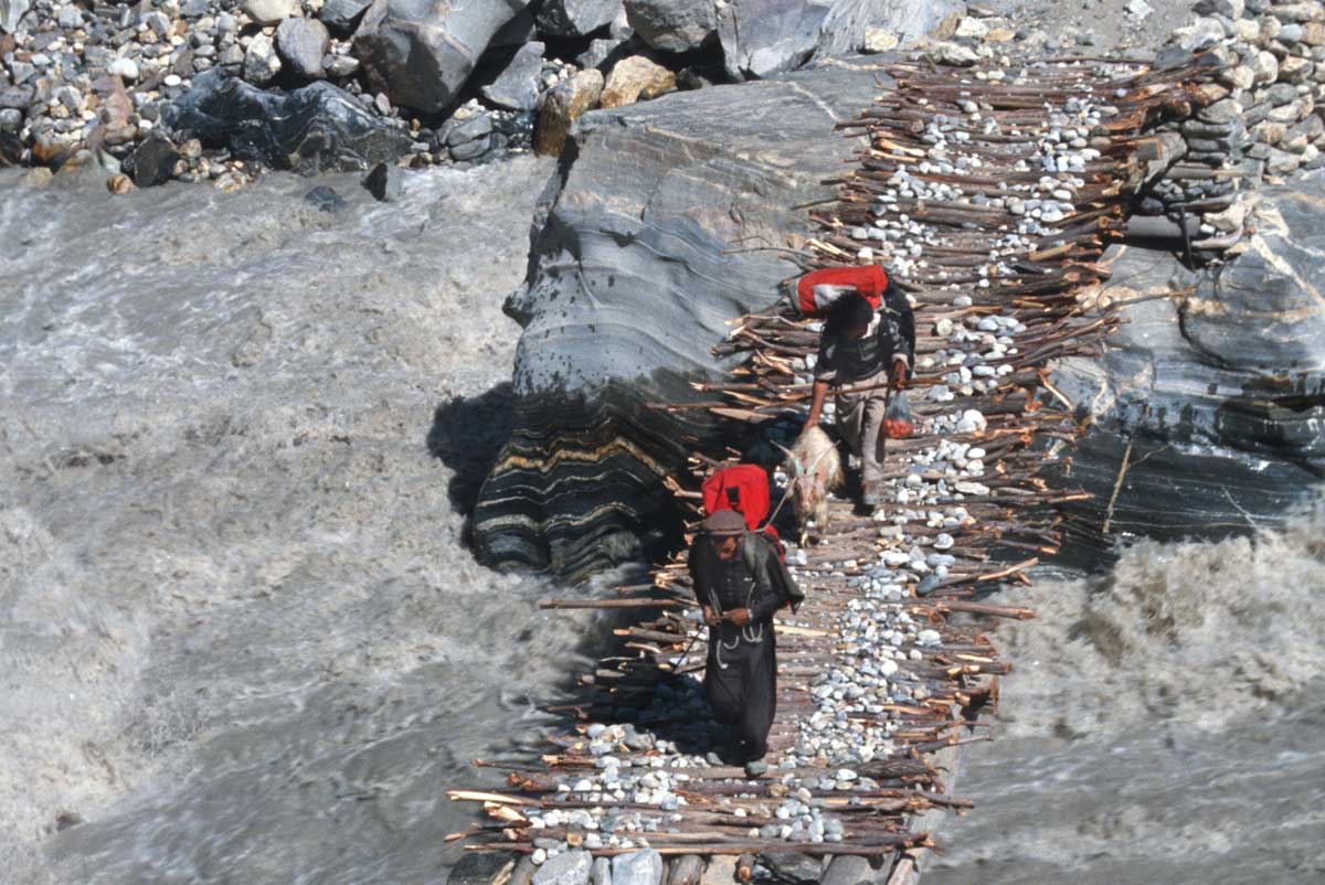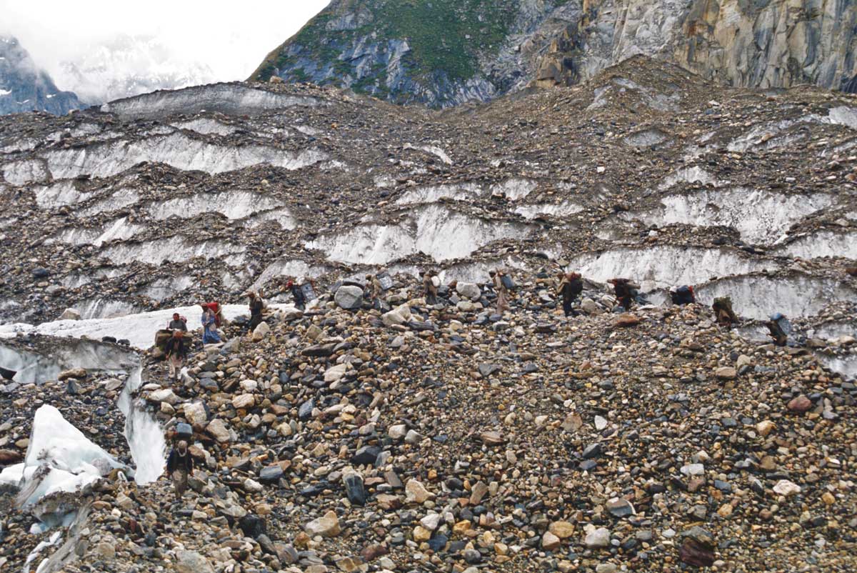 Porters moving expertly across the gravel and chunks of ice, making the expedition possible.