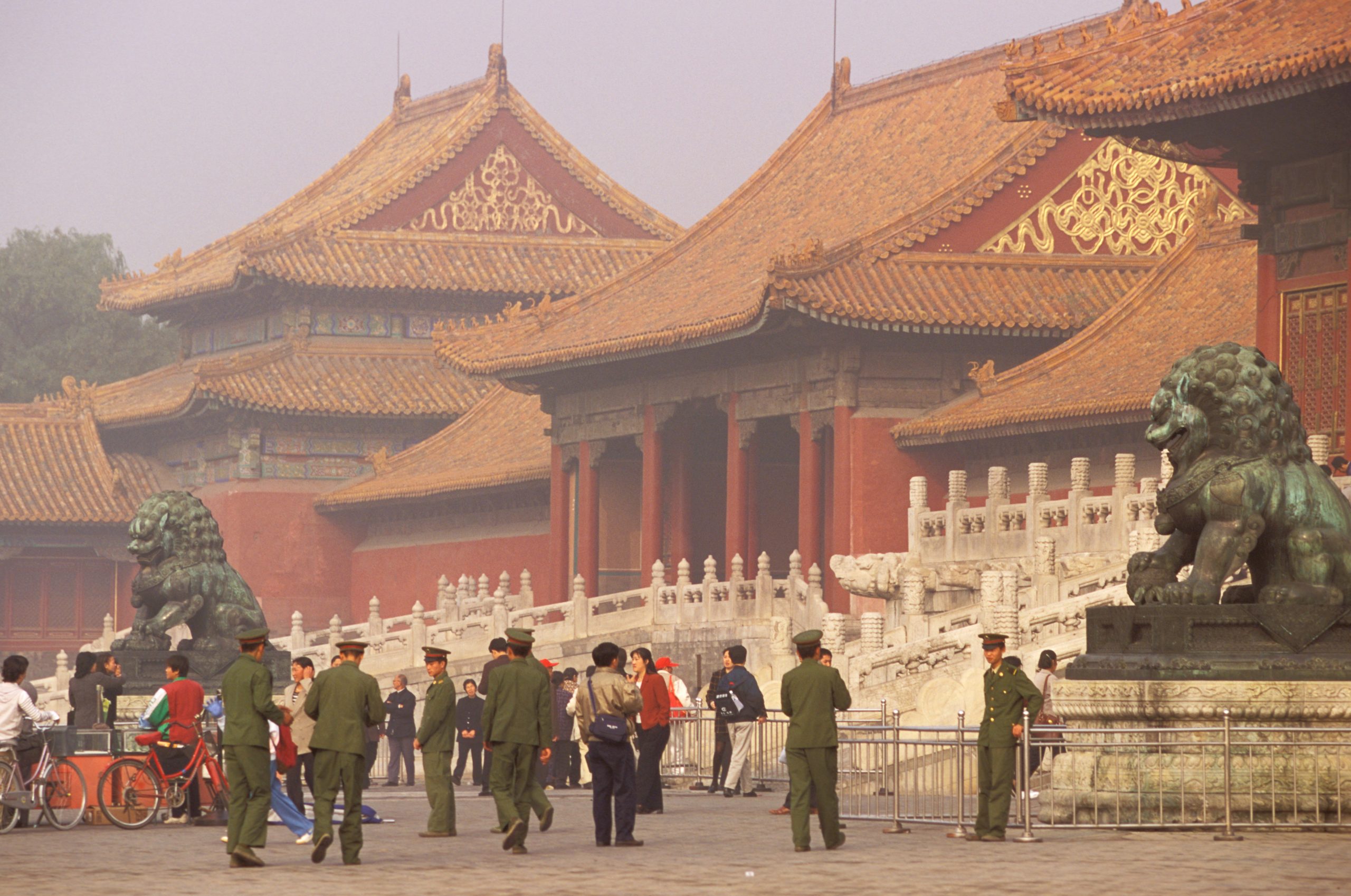 That bitter dark morning — the eastern sky showing just a hint of lightening gray — opened with the crash of the unlocking of the vast gates, and a sudden synchronized clatter as the honor guard swept out from the main south gate of the Forbidden City. Forty identically tall soldiers goose-stepped across the avenue, white belts shining, bayonets glinting in the floodlights, and they wheeled up toward the huge flagpole at the northern side of Tian’anmen Square .