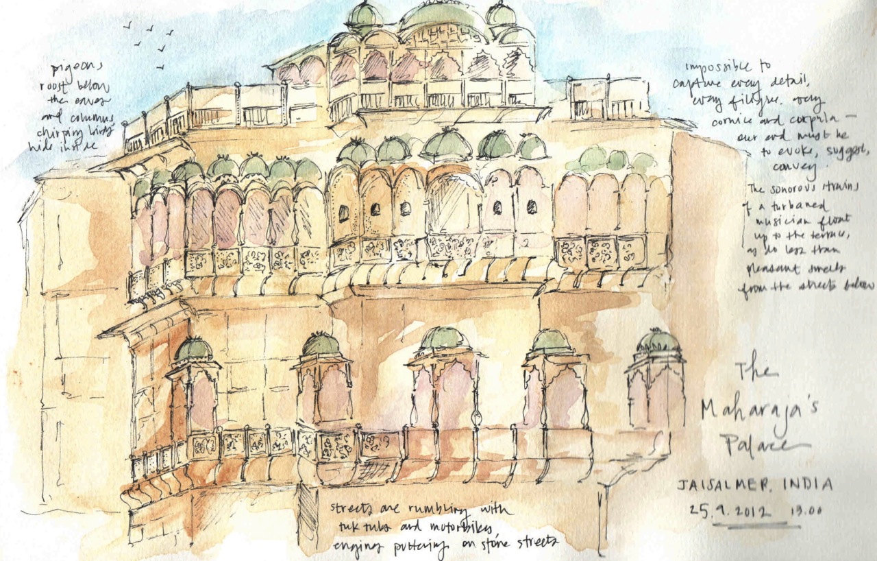 There are a few things this sketch shows: the palace’s intricate cupolas and balustrades, nearly impossible to capture in full detail on paper; the pigeons perching like hideaways among the eaves; and the monochromatic shade of gold that cloaks all of Jaisalmer’s hilltop fort, positioned at the far western edge of India in the Thar Desert.