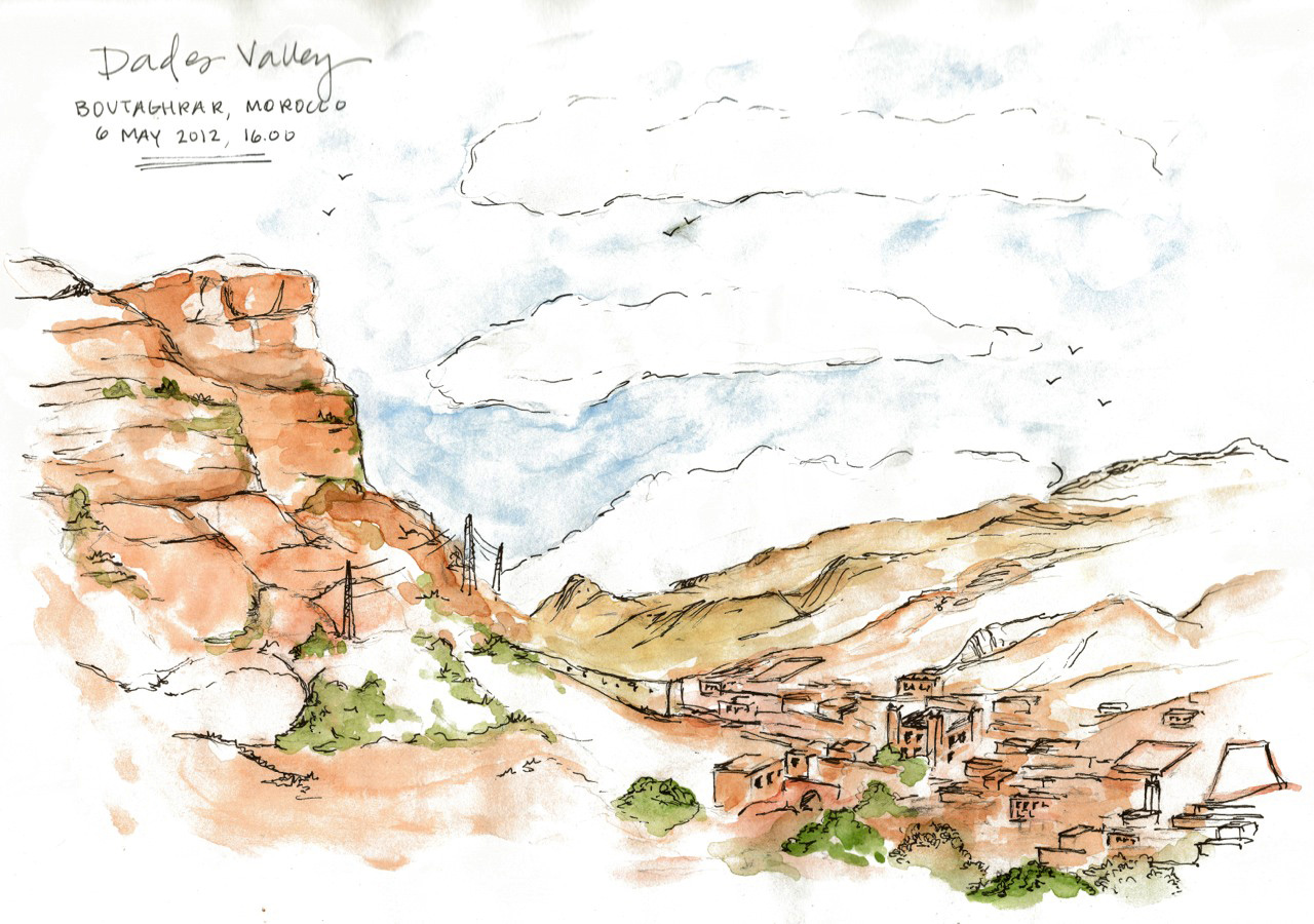 Liz left the following morning, and I spent my last afternoon in a village called Boutaghrar. I spread out my sketchbook and paints on a hotel rooftop and attempted to capture the scene before me.