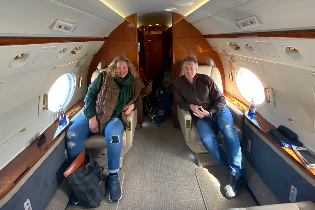 There is no VIP vehicle waiting. Our kit is loaded onto sleds and we march over to a Basler BT-67 propeller plane. This is a modified DC3, a very old WWII aircraft, and the transport workhorse in much of Africa. There are no cushy leather seats here. The front wheels have skis on them. The gorgeous Gulf Stream we flew in on simply isn’t practical in these conditions. We land half an hour later, on what seems like another planet, and pile into huge oversize trucks for the drive to camp.