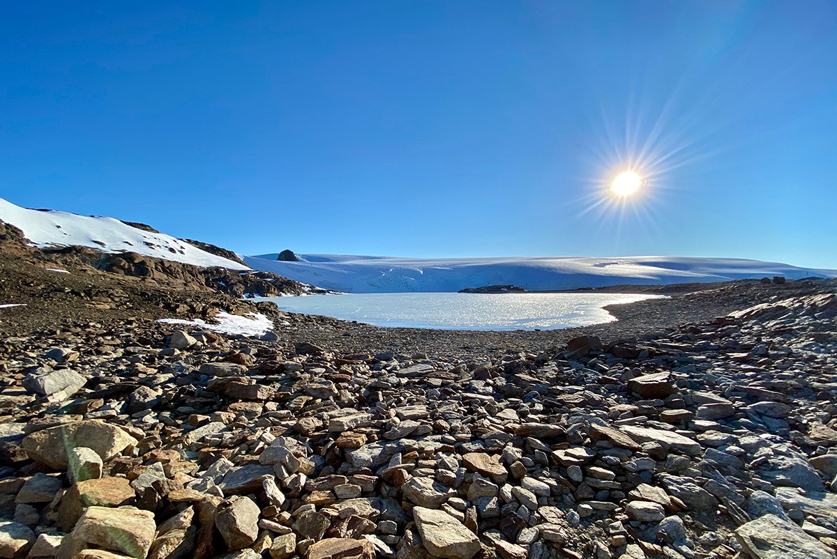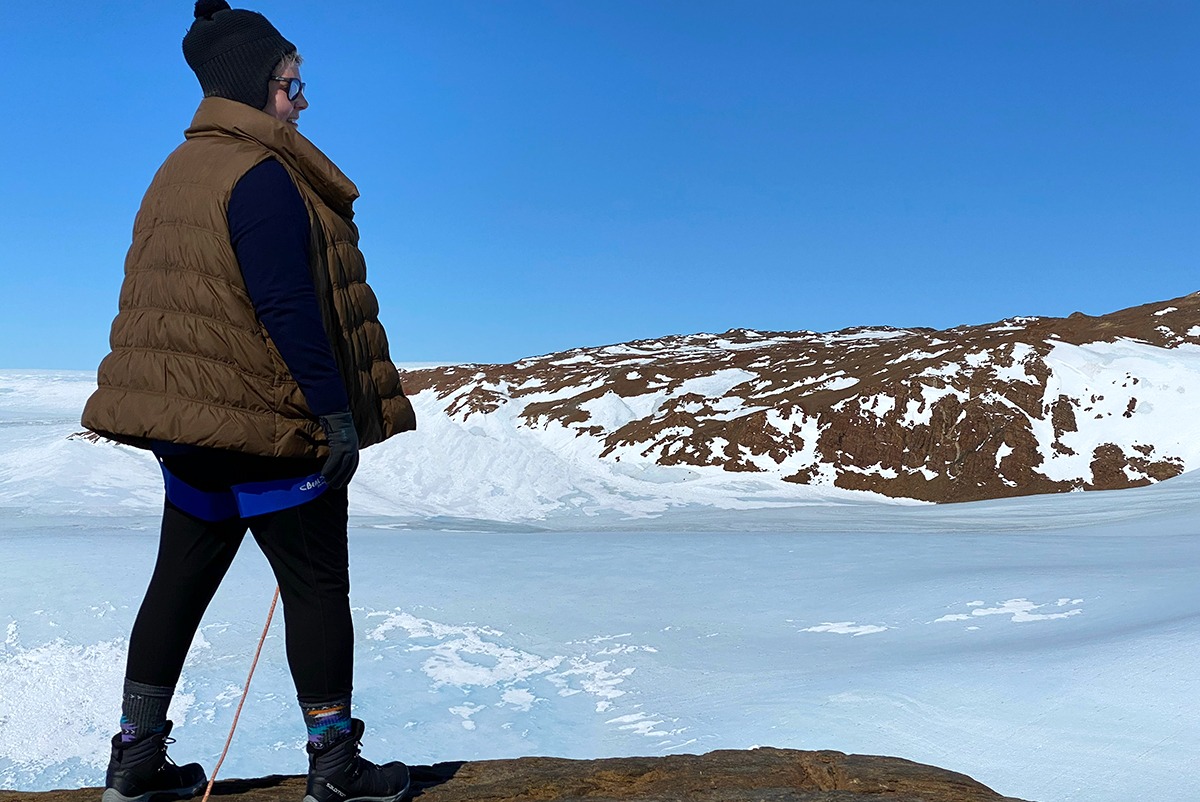 And we hike! Every day is physically challenging with five- or ten-mile hikes. We have our crazy level-four hiking boots on, like we were headed for Mount Everest, and we carry all our gear so we can layer things on and off. We go a couple hundred feet down the rocks to the start of a frozen lake, which the camp overlooks, and then we put on our crampons and walk across the lake. Then we take them off and walk through the snow a bit and then we put them on again, having to slam our feet into them so they’ll hold us on the slippery ice. We climb up 90-degree-angle rock faces and ice glaciers and go down them. Under the glacier as well as above it. That’s just something you do.