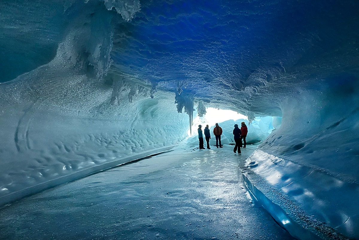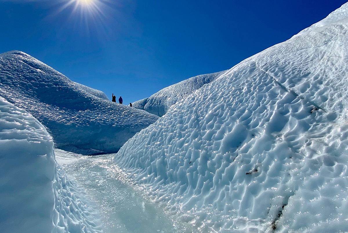 We rappel into ice tunnels with now-frozen rivers running under them. Some of the openings are the width of our shoulders. I squish through—this is hard ice, not snow—and land in a huge tunnel. Then we’re going through these crevasses which are really, really narrow and we have to take off our backpacks and slide in sideways. The blue color of the ice is crazy! We all feel like we’re on LSD.