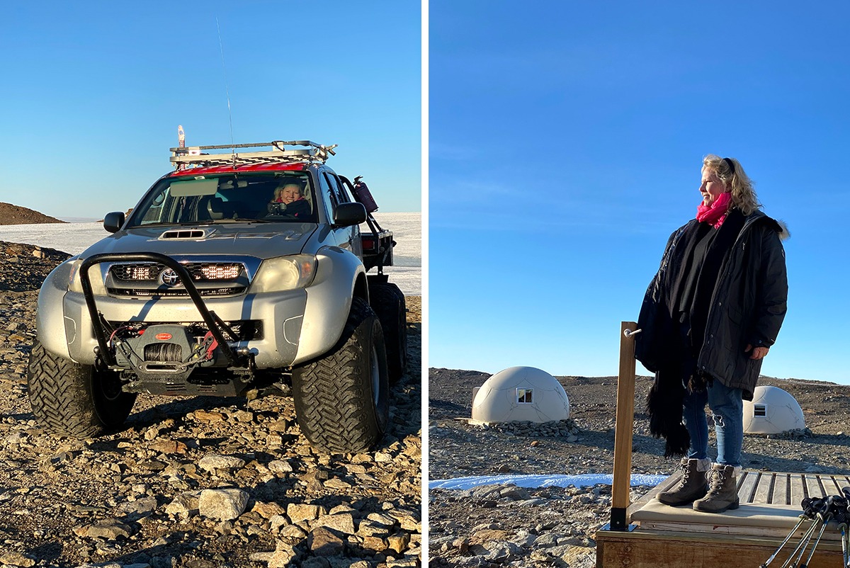 At the camp, we stay in spacious private pods overlooking a frozen lake. They are simply beautiful inside. Nearby are larger pods for dining and relaxing. After a day hiking inside a glacier, we make our way to the main pod and the guys go out to chip ice, bringing us back cocktails with blue glacier ice with bubbles in it. It’s surreal! It’s amazing! That’s exactly why we all feel stoned. You can’t help but be happy.