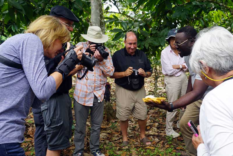Throughout the West Africa trip, Noah made unplanned stops on the side of the road to visit local producers of cacao, cassava, palm nuts, and other local products. Here, Noah is explaining to our group how cacao grows and is harvested.