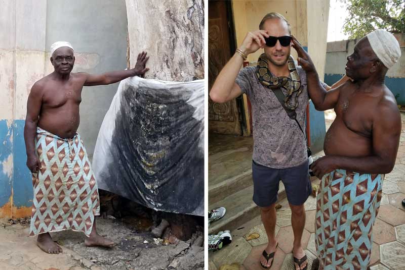 The chief priest eventually came out to greet us, with a python around his neck. He asked where we were from and told us about voodoo culture and traditions. He also asked us to put the snake around our neck—for good luck (and a good photo op).