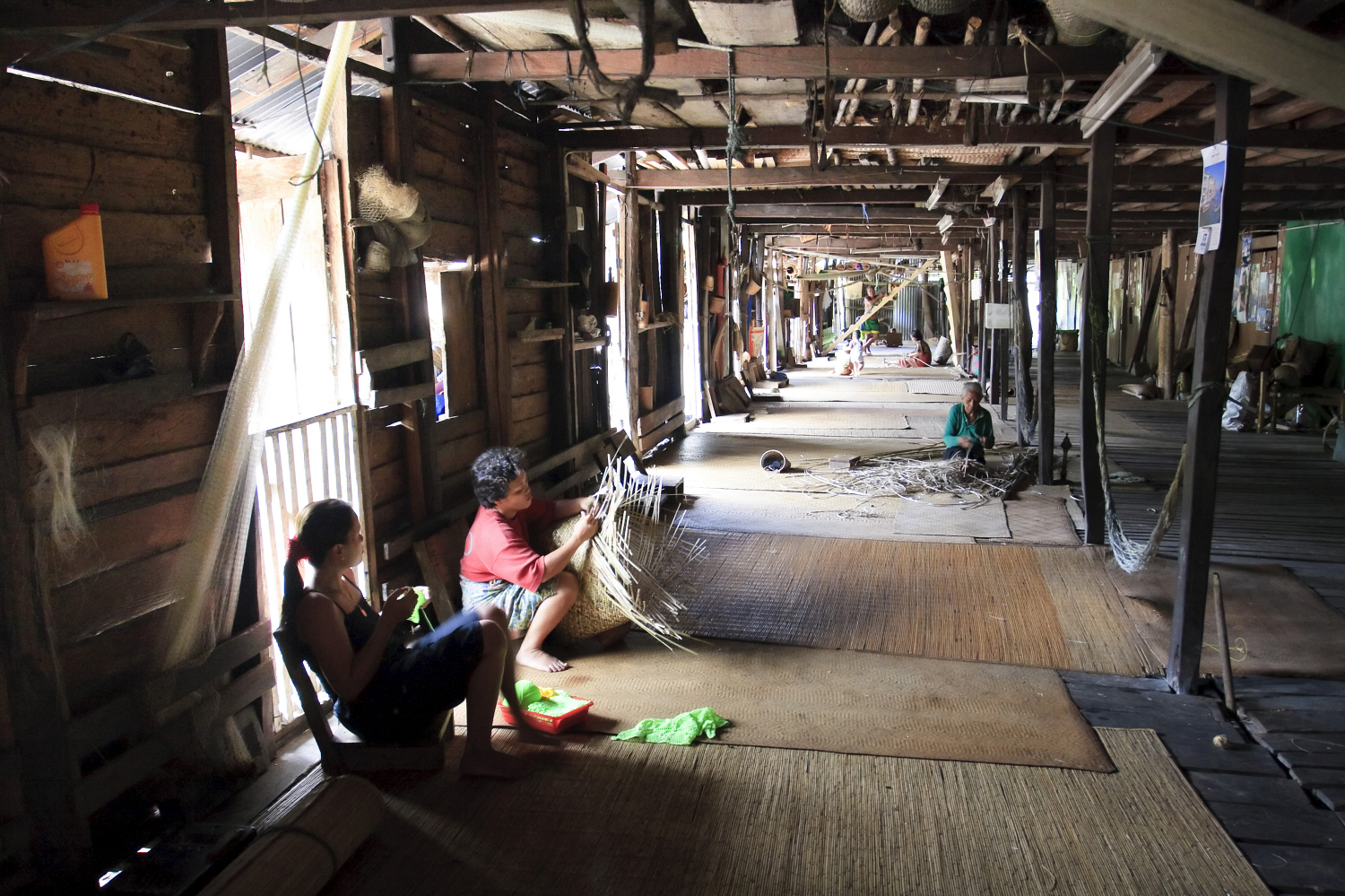 I stayed the night at Long Panai. It wasn’t a scheduled stop. The fuselage made a slow fly-past, and I leapt ashore with a triple jump that would have astonished my old gym teacher. Long Panai was a substantial place; the longhouse ran along the riverbank for a quarter of a mile and contained 120 families. People sat outside on the covered verandah sifting rice and gossip. The young people looked like sober suburban kids, with their baseball caps turned backwards, while their parents looked like New Age freaks: a confusion of wild tattoos, pierced body parts, dangling ear lobes, patchwork clothing and funny-looking cigarettes.
