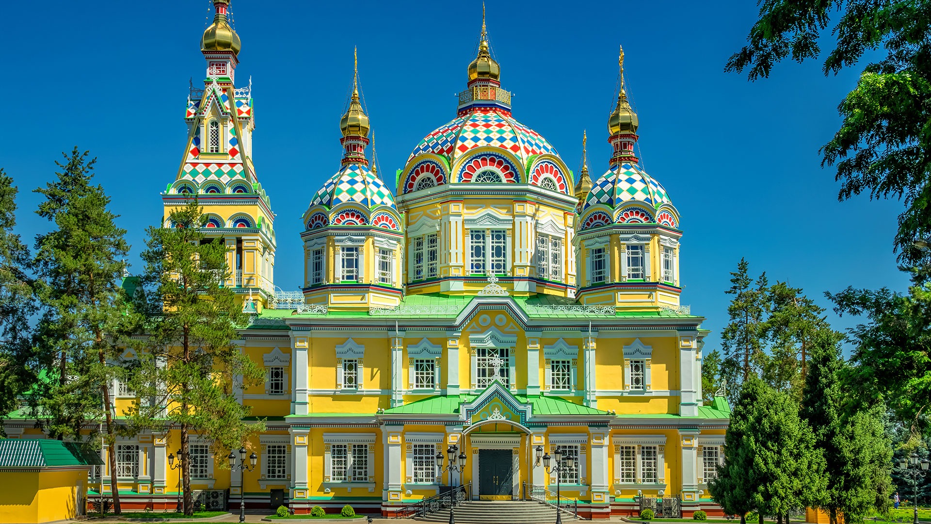 Arrive in Almaty, Kazakhstan Stroll through Panfilov Park and visit kaleidoscopic Zenkhov Cathedral Board the elegantly appointed Golden Eagle